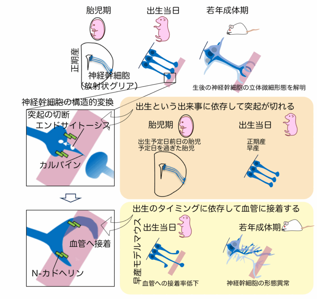 胎児期と成体の神経幹細胞は、形態が大きく異なります。これまで、成体の神経幹細胞が長期にわたって幹細胞性を維持するためには、近傍の血管への接着が重要であることが示されてきました。一方で、胎児期の神経幹細胞がいつ・どのようにして成体型へと構造的に変化するのかについてはこれまで不明でした。魚類では神経幹細胞が成体になっても胎児期とよく似た形態を保つことが知られています。そこで私たちは、胎児が水中である子宮内から空気中の環境へと移行する「出生」というイベントが、神経幹細胞の構造的変換のトリガーとなるのではないかと考え、本研究を行いました。